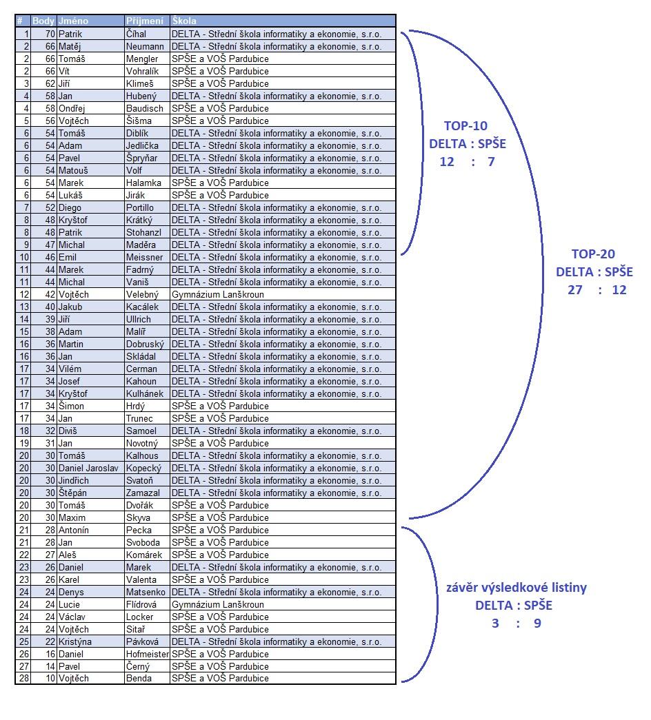 Jak už to v Pardubickém kraji bývá, tak i letos se soutěž stala bitvou dvou škol naší DELTy a státní SPŠE. Můžeme se pyšnit celkovým vítězstvím Patrika Číhala (navíc s plným počtem bodů), ale je třeba spravedlivě říci, že soutěžící na prvních čtyřech místech byli co do programátorských kvalit prakticky zcela vyrovnaní. Ač to zní jako matematický nesmysl, tak do první desítky se vešlo 12 soutěžících z naší školy a 7 ze SPŠE. :-)
