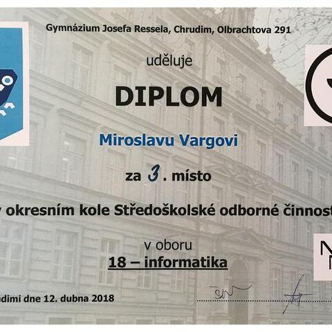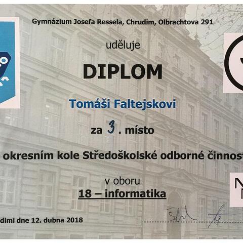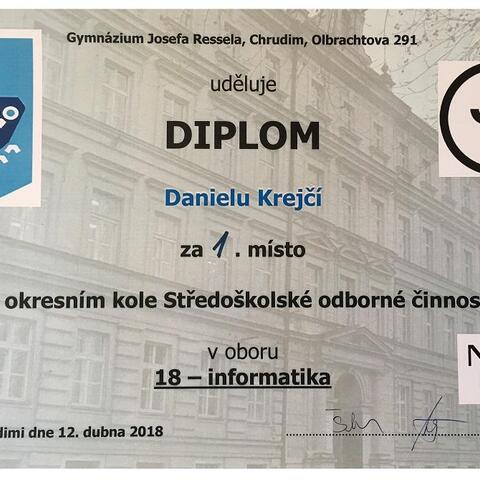 Chrudim, 12.4.2018: Letošního 40. ročníku středoškolské odborné činnosti se v oboru Informatika v okresech Pardubice a Chrudim účastnilo celkem 5 projektů. Studenti ze soukromé školy informatiky a ekonomie DELTA se předvedli ve výborném světle. Daniel Krejčí zvítězil a Tomáš Faltejsek s Miroslavem Vargou skončili třetí. Dan Krejčí zároveň postupuje do krajského kola, kde mu budeme držet palce.