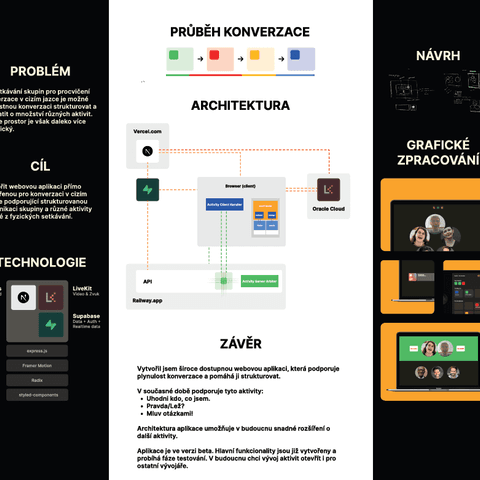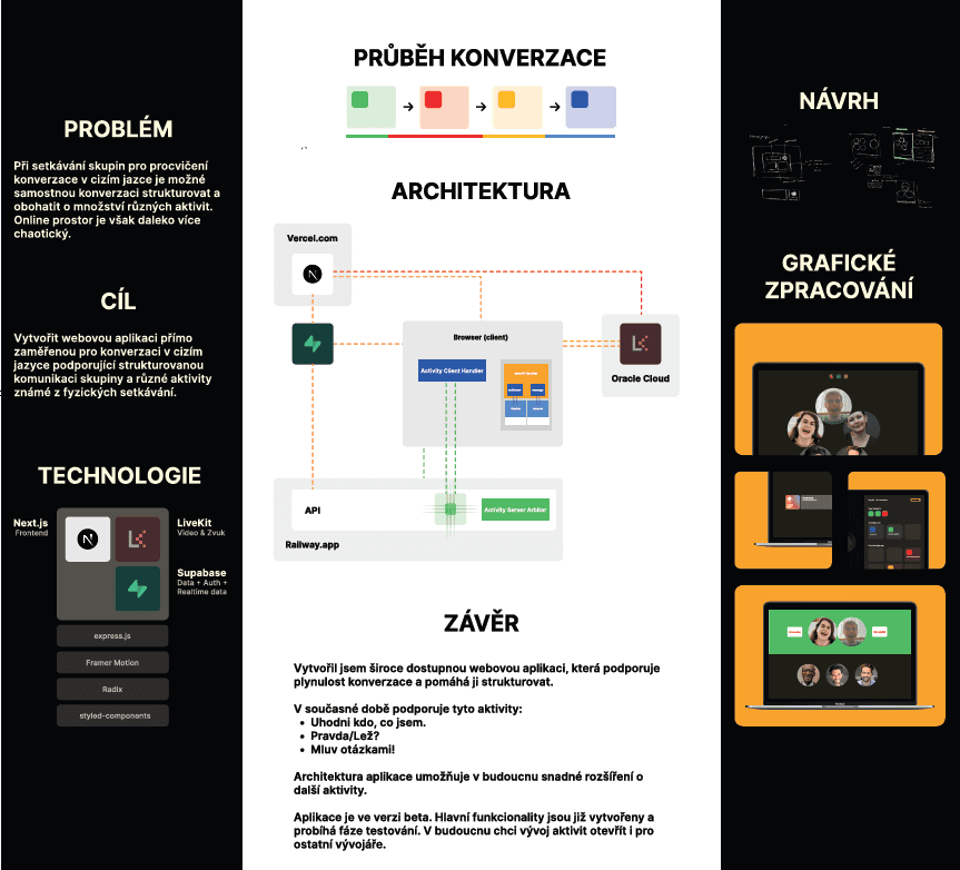 Kryštof vytvořil webovou videokomunikační platformu podobnou např.: Teams,... usnadňující průběh on-line konverzace v cizích jazycích integrovanými aktivitami (např. "Hádej, kdo jsem?).