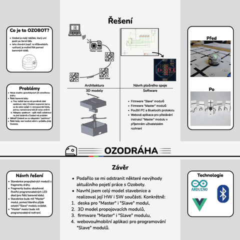 Cílem projektu bylo vytvořit modulární elektronickou stavebnici pro vytváření různých drah pro robůtky Ozobot. Ovládání řídících barevných kódů pro Ozoboty bude řešeno dynamicky pomocí LED diod, které jsou řízeny přes webovou aplikace - řídící modul s mikrokontrolérem a koncový modul s mikrokontrolérem a 4 LED diodami.