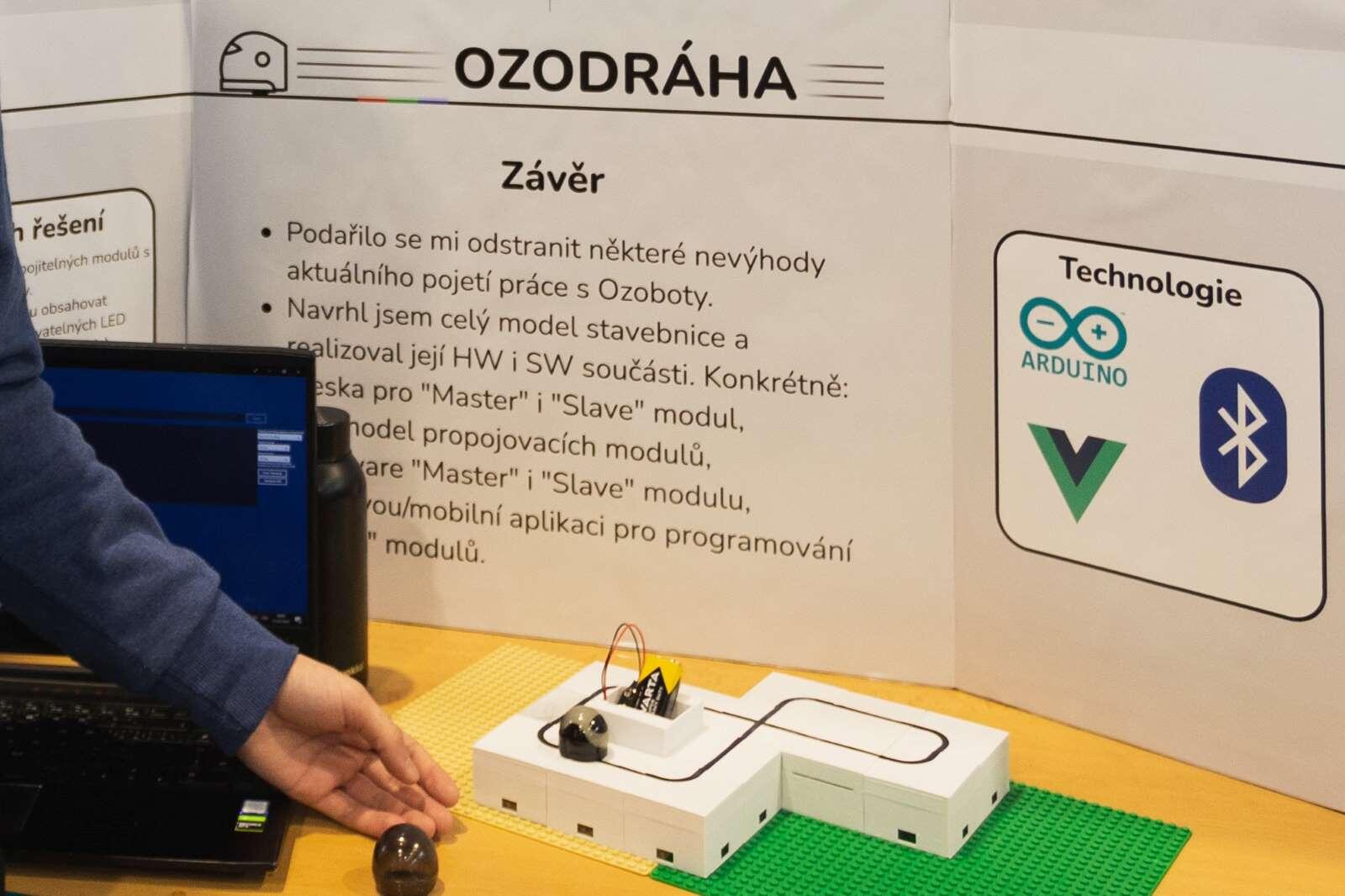 Matěj navrhl a vytvořil modulární elektronickou stavebnici pro stavbu cvičné dráhy pro školní roboty řízené světelnými kódy Ozobot.