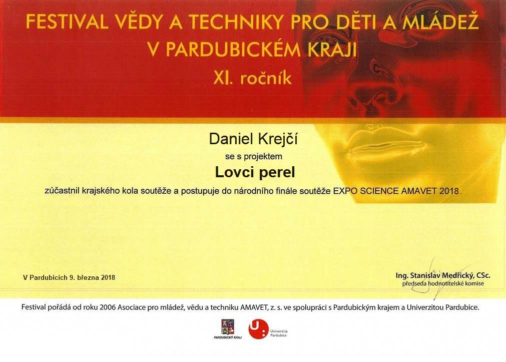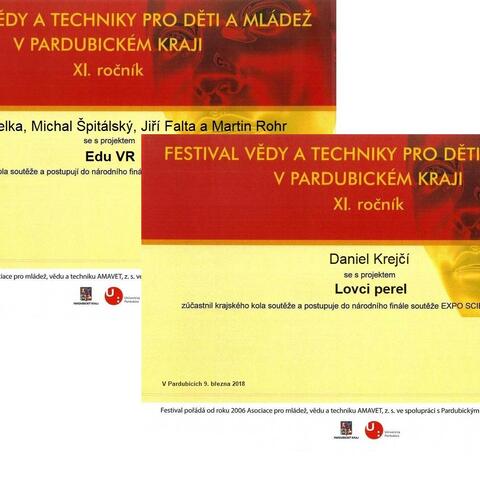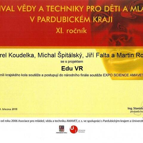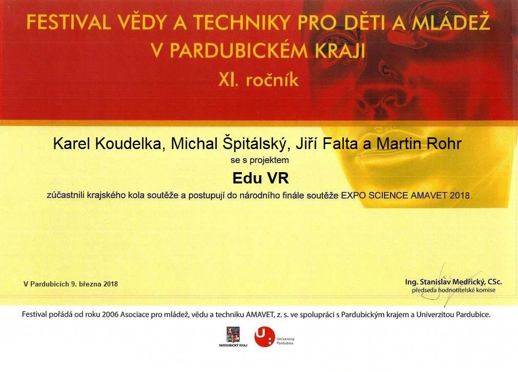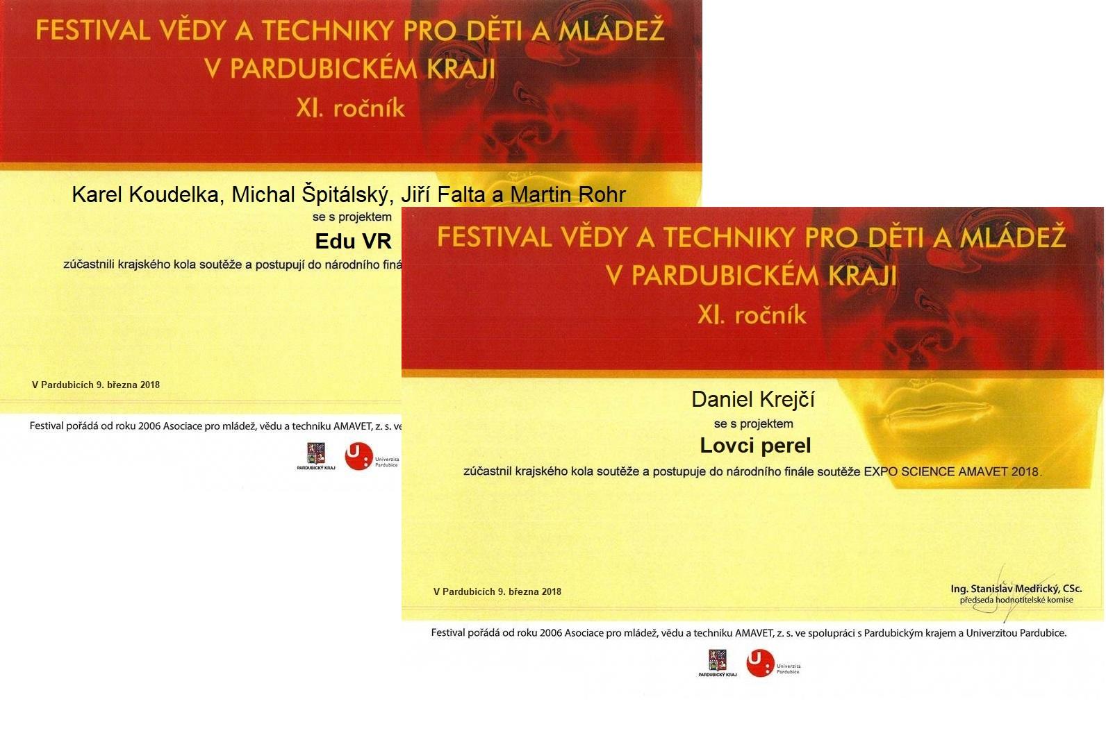 Pardubice, 8.-9.3.2018: Dva IT projekty postoupily do ústředního kola EXPO Science AMAVET 2018. Konkrétně maturitní projekt Daniela Krejčího Lovci Perel a potom projekt na výukové využití virtuální reality EduVR kluků z druháku, jmenovitě Karla Koudelky, Michala Špitálského, Martina Rohra a Jirky Falty.