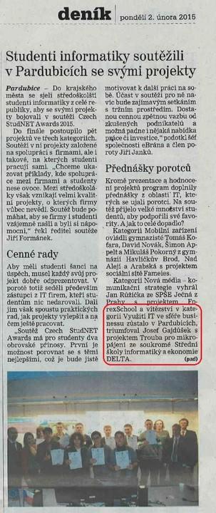 29. ledna 2015, Pardubice - Do Pardubic se sjeli středoškolští studenti informatiky z celé republiky, aby se svými projekty bojovali v soutěži Czech StudNET Awards 2015. Do finále postoupilo pět projektů ve třech kategoriích. Soutěžili v ní projekty založené na spolupráci s firmami, ale i takové, na kterých studenti pracovali sami. „Chceme ukazovat příklady, kde spolupráce mezi firmami a studenty nese ovoce. Mezi středoškoláky však vznikají velmi kvalitní projekty, o kterých firmy vůbec nevědí. Soutěž bude pomáhat, aby se firmy i studenti vzájemně našli a byli si nápomocni,“ říká Jiří Formánek, ředitel soutěže.