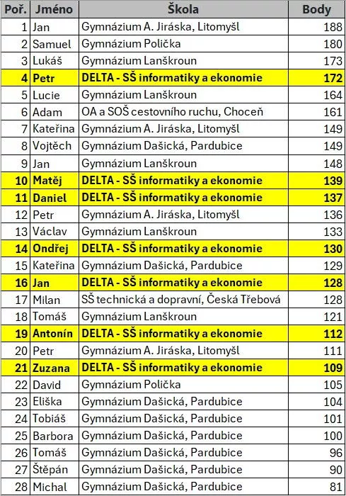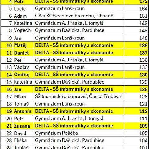 1.2.2024, Litomyšl: Krajského kola soutěže Bobřík informatiky se zúčastnilo i sedm statčných ze Střední školy informatiky a ekonomie DELTA, Pardubice. Z DELTY postoupila do krajského kola letos druhá nejpočetnější ekipa (hned po Gymnáziu Dašická) a obsadila čtvrtinu všech míst v krajském kole. V silné konkurenci si nevedli vůbec špatně. Na 4. místě skončil Petr Švestka se 172 body (se ztrátou jediného bodu na 3. místo). Ani ostatní se však mezi nejlepšími v Pardubickém kraji neztratili.
