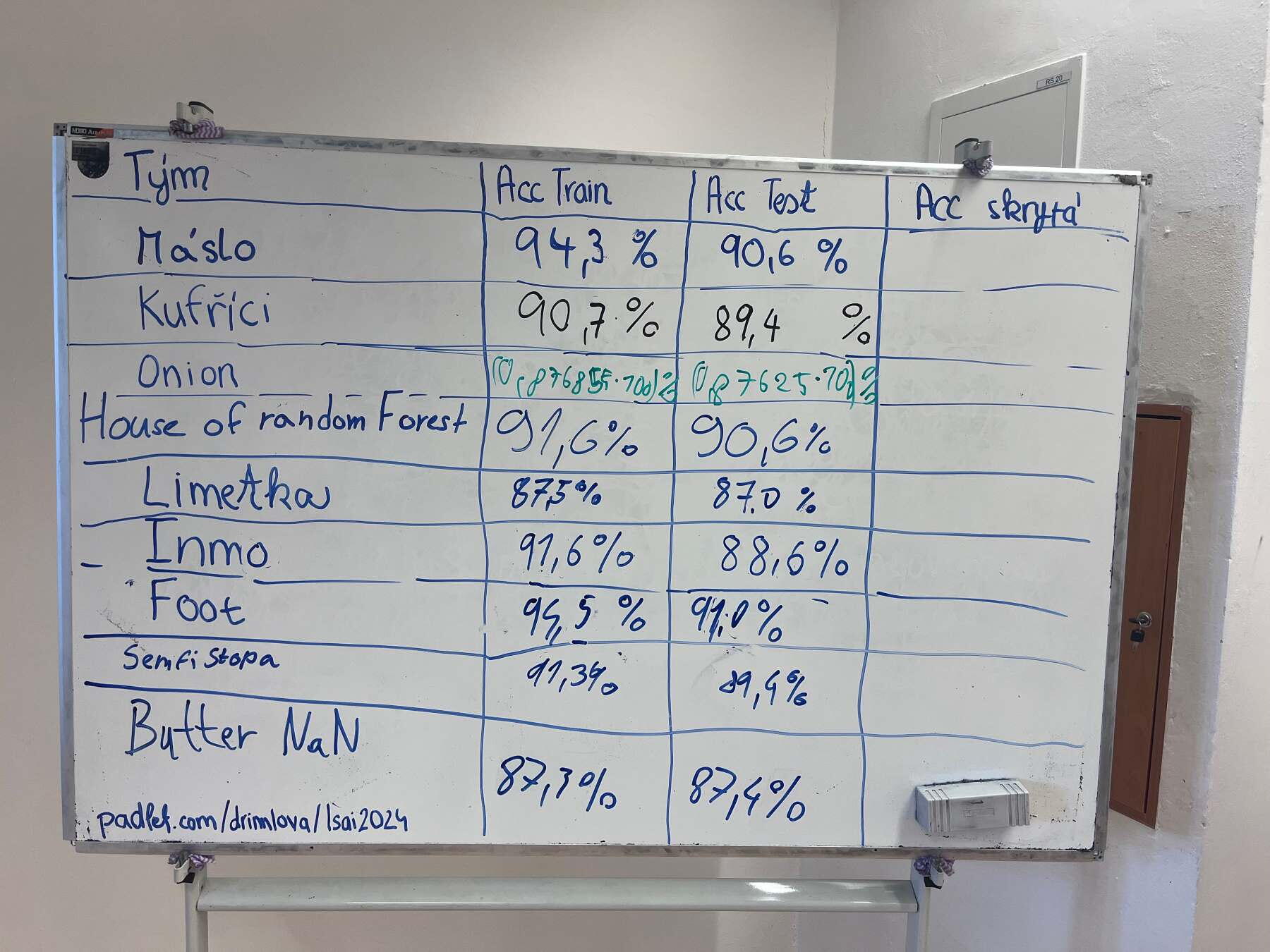 - Tým Housef of random Forest, který vypadal hodně dlouho jako velký favorit, nakonec svůj natrénovaný model "rozbil". Budiž mu ke cti, že tedy na tabuli uvedl přesnost 50% - což se rovná házení kostkou. Získal aspoň cenu za nejhezčí název týmu. :-)