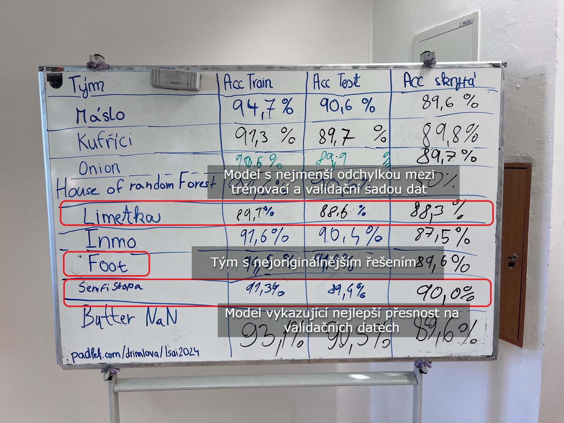 - Cenu za nejmenší odchylku přesnosti na trénovací a validační sadě si odnesl tým Limetka složený z Františka Balcara, Vojty Kašky a Filipů Kalvacha a Rokose z 1. ročníku.