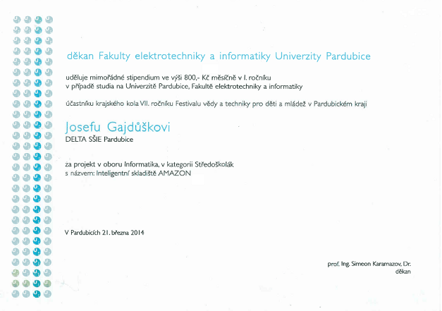 - Obdržel cenu děkana Fakulty Elektrotechniky a informatiky Univerzity Pardubice,