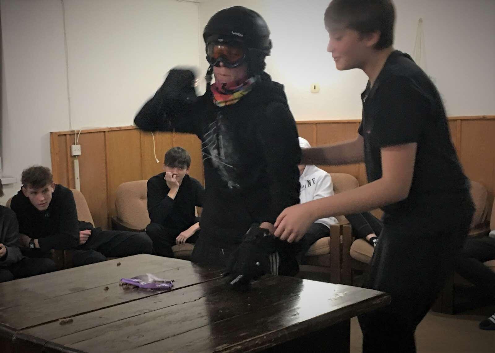 Večer jsme si před Werewolfem zahráli hru „Na hamouna“. Spočívá v tom, že je na stole čokoláda, vidlička a nůž. Kolem stolu byli studenti v kruhu a postupně se házelo kostkami. Kdo hodil šestku (v našem případě lebku), mohl jít rychle jíst čokoládu, dokud nehodil šestku někdo další (ten ho střídal). Čokoláda je ale nebezpečná věc, takže se mohla jíst jenom v lyžařské helmě, brýlích a lyžařských rukavicích. Takže obvykle ani šťastlivci, kteří hodili šestku, stejně nestihli čokoládu ochutnat. Než se navlékli do všech ochranných pomůcek, padla šestka někomu dalšímu. A i když náhodou trošku času zbylo, zkuste si jíst čokoládu příborem. Jedna tabulka čokolády nám vydržela skoro půl hodiny.