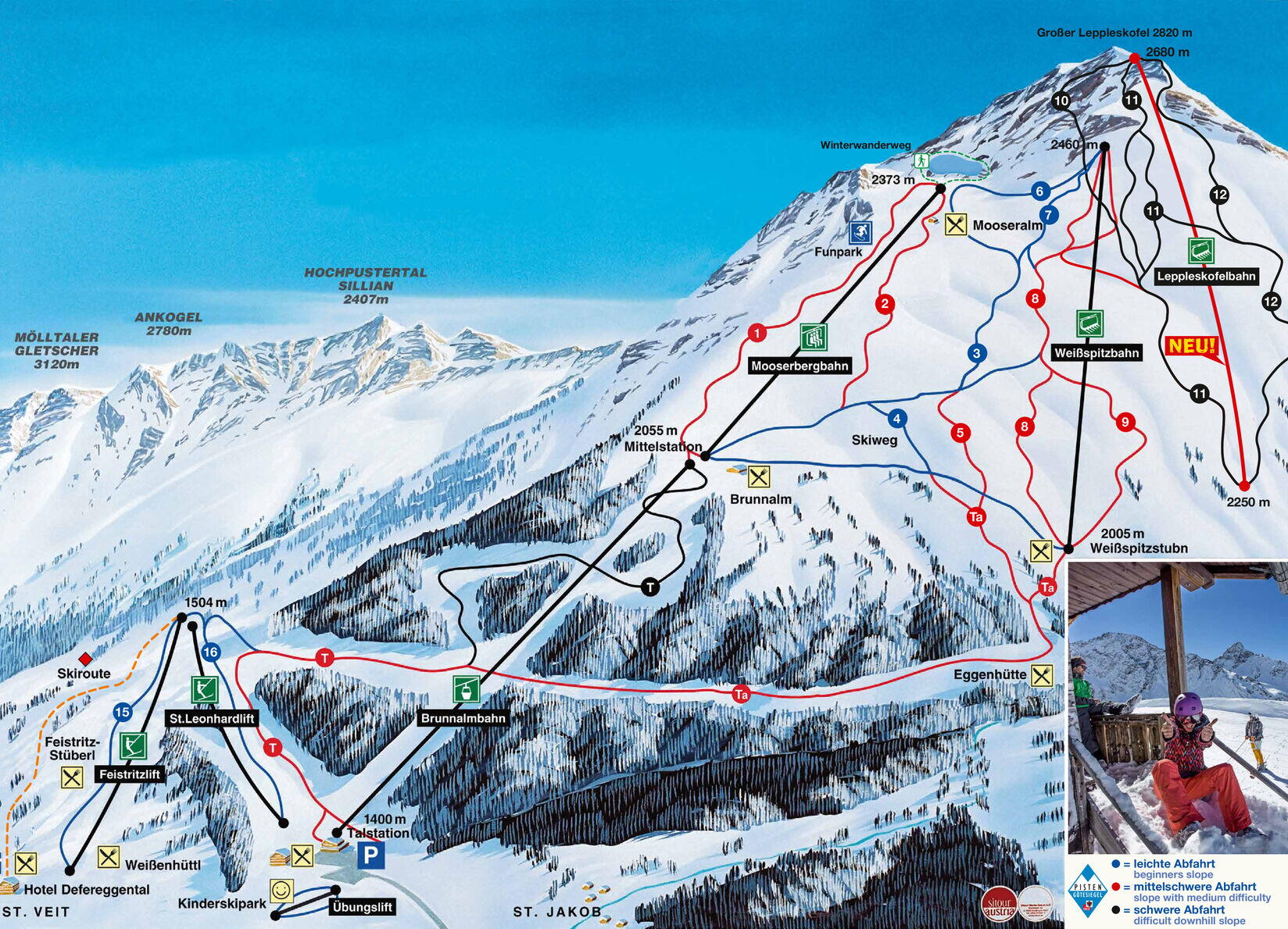 Zatímco až doteď jsme lyžovali v naprostém ažúru, tak v neděli se mělo začít trošku kazit počasí. I proto jsme jeli do Sillianu, kde bývá ze všech středisek počasí nejstálejší. V Lienzu jsme uhnuli doleva a jeli dál údolím Drávy skoro až k hranicím s Itálií. Sillian je poměrně velké středisko s krásnými sjezdovkami všech obtížností. Bohužel nás zde potkal první (a zaplať pánbůh také jediný) úraz. Michalovi se nějak rozjely lyže a "urval" si koleno. Takže jsme to letos měli i s horskou službou. Svezli ho do nemocnice v Lienzu, tam mu udělali rentgen, dostal ortézu a v ČR ho, chudáka, čekají další vyšetření. - Asi má urvané vazy. Až po vyšetřeních uvidíme, jak moc.