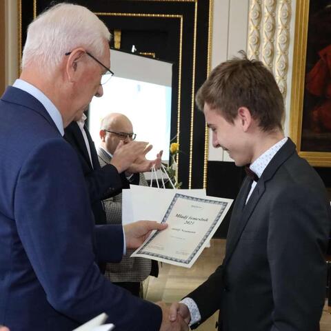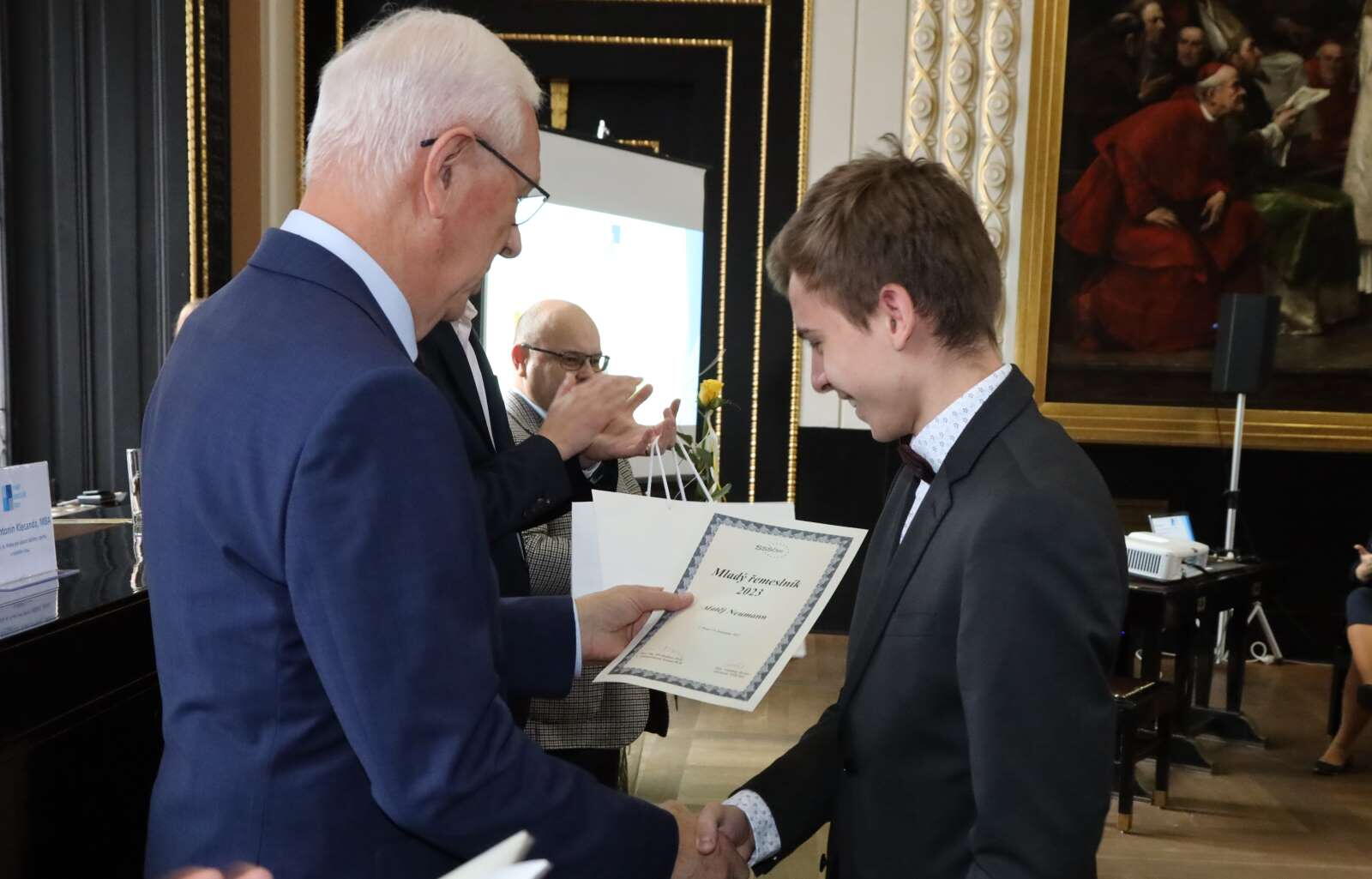Matěj Neumann převzal na Staroměstské radnici z rukou prof. Ing. Jiřího Drahoše, Dr.Sc. ocenění Mladý řemeslník.