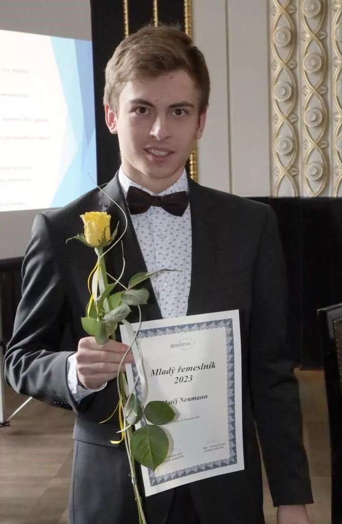 Praha, 15. listopadu 2023: V Brožíkově síni Staroměstské radnice v Praze proběhlo vyhlášení výsledků soutěže Mladý řemeslník roku 2023. Mezi 25 oceněnými převzal ocenění také náš student Matěj Neumann.