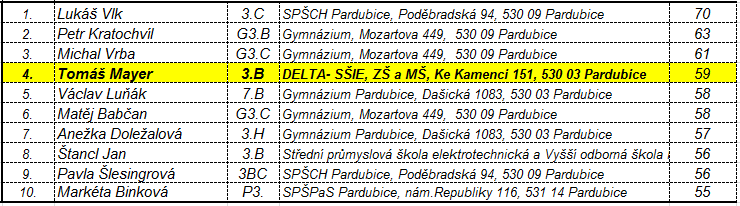 V nejvyšší kategorii Student se v letošním ročníku umístil těsně pod stupni vítězů Tomáš Mayer ze 3.B.