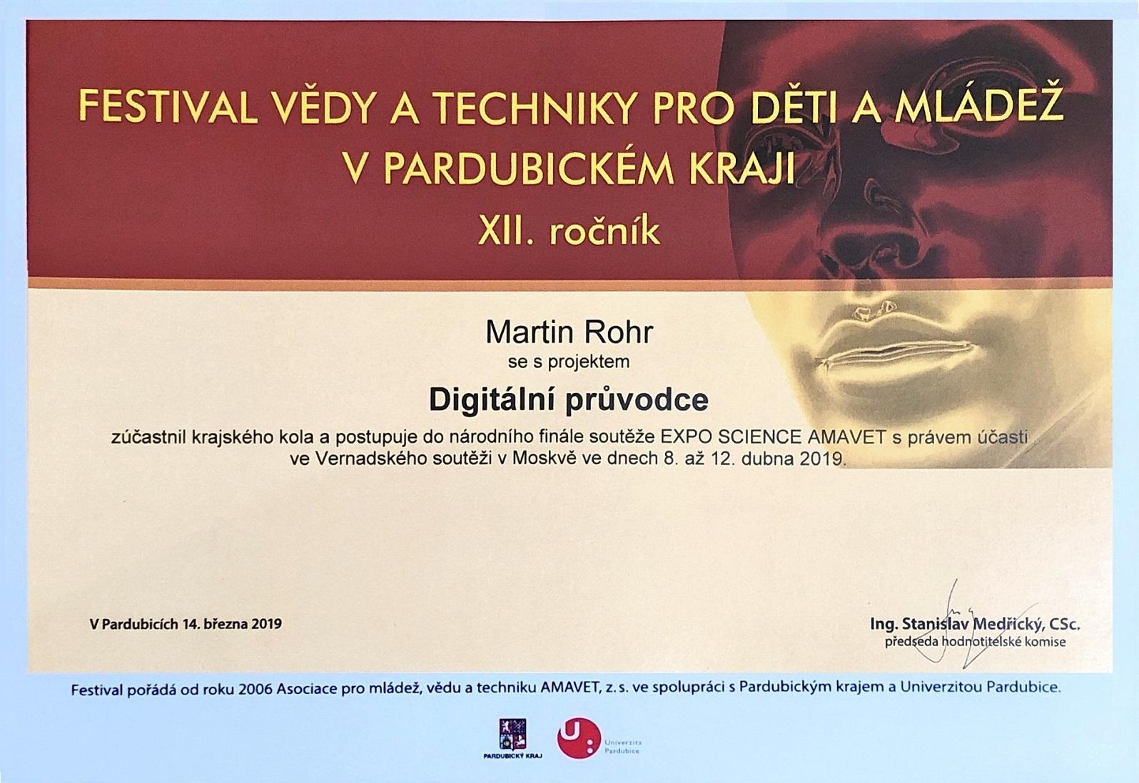 Když už jsme u Soutěže Vernadského, další, kdo se z naší školy podívá do Moskvy, je Martin Rohr ze 3. ročníku. Od loňských praxí pracoval na mobilní aplikaci "Digitální průvodce Hamzovým arboretem" pro společnost Rehamza potažmo pro Hamzovu léčebnu v Košumberku. Aplikace určí pomocí GPS svoji aktuální polohu a nabídne obrazové a textové informace například o stromu, na který se právě díváte. Martin také mluví výborně anglicky, strávil rok na studiích v USA.