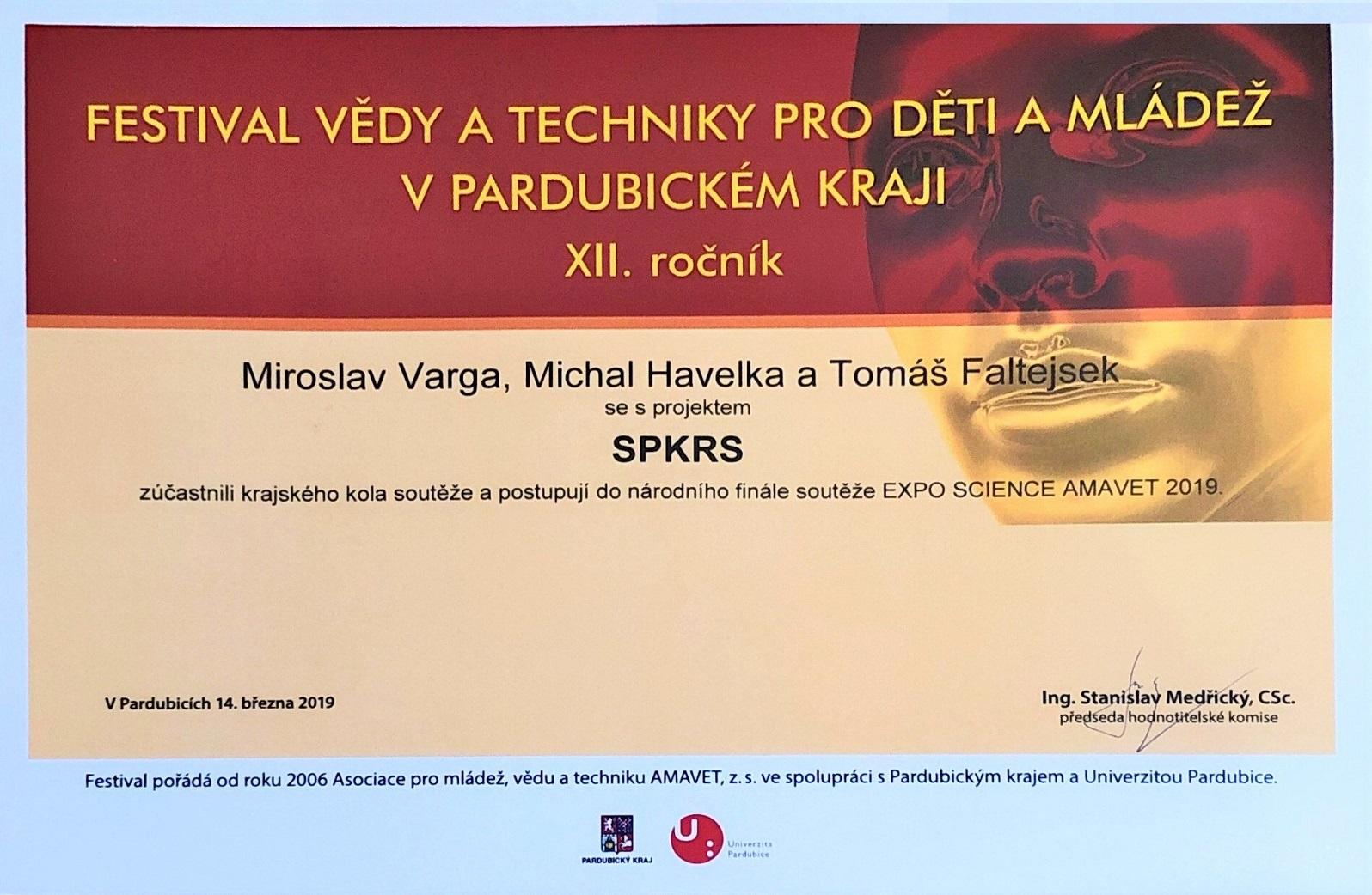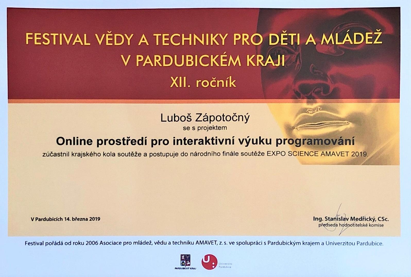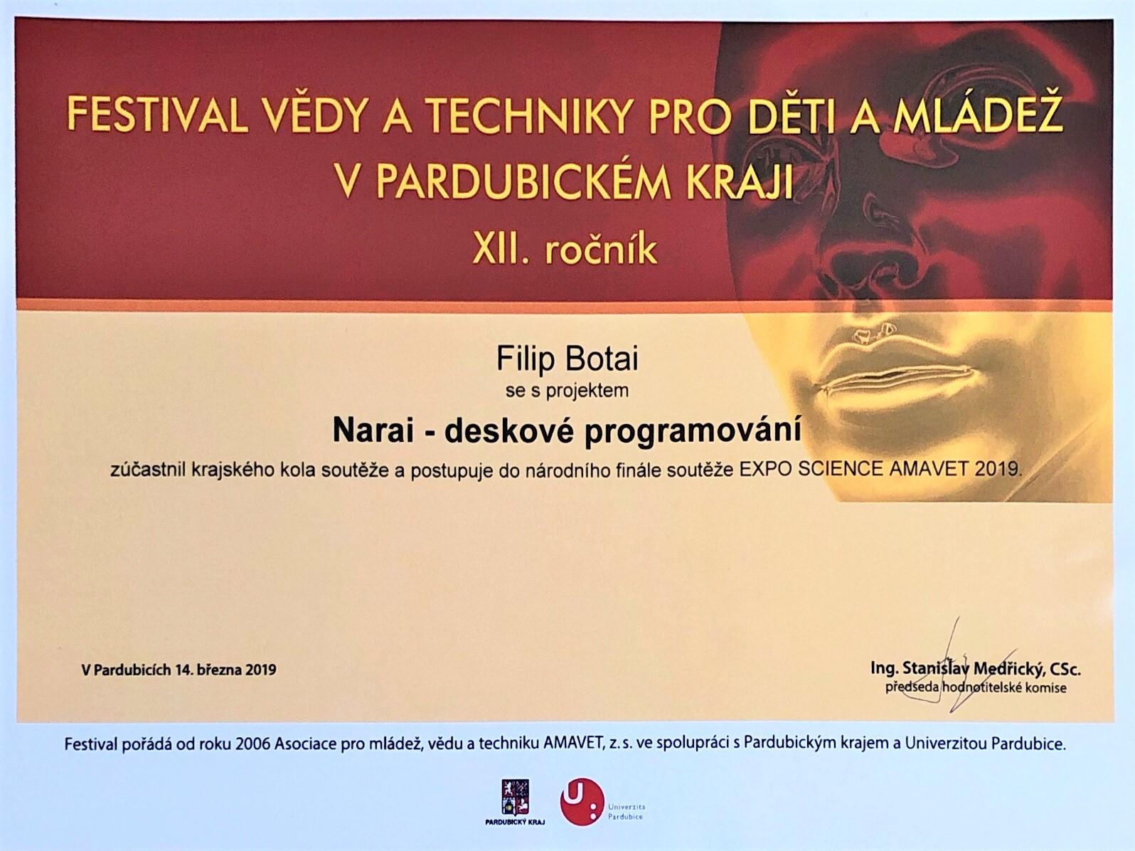 Projekt Filipa je mým největším favoritem. Jeho projekt je tak rozsáhlý, že ani nevím, odkud jej začít popisovat. Vytvořil stolní hru pro výuku programování, která obsahuje papírové kartičky s programátorskými příkazy a dalšími fragmenty programátorského kódu. K tomu naprogramoval mobilní aplikaci, kterou poskládaný program nasnímá do mobilu, vyhodnotí jej a pokusí se jej provést. Zní to relativně jednoduše, ale Filip musel mimo jiné vytvořit vlastní programovací jazyk a k němu překladač. Před touto prací rozhodně klobouk dolů. I on postoupil do národního kola Expo Science AMAVET. Mimo to získal zvláštní cenu děkana Fakulty elektrotechniky a informatiky Univerzity Pardubice.
