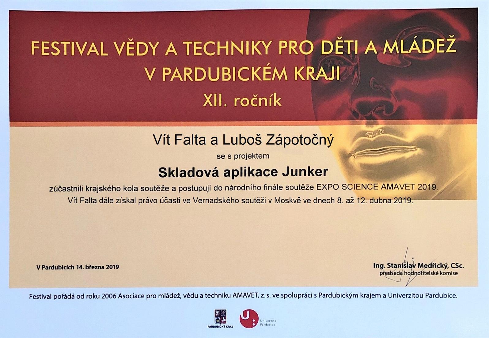 Luboš s Vítkem navrhli a vyvinuli aplikaci pro sklad s pomůckami a náhradními díly pro holickou společnost Junker. Jedná se o klasický databázový informační systém s mobilní aplikací s požadavky pro skladníka. Luboš stojí za celým návrhem systému a především jeho backendovou částí. Vítek se postaral o mobilní aplikaci. Na škole se snažíme propojovat mladší studenty se zkušenějšími, aby se od nich něco přiučili. :-) Luboš bude letos maturovat, takže do Moskvy nemůže, Vítek je ale teprve ve 2. ročníku, takže do Moskvy na soutěž Vernadského za tento projekt pojede on.