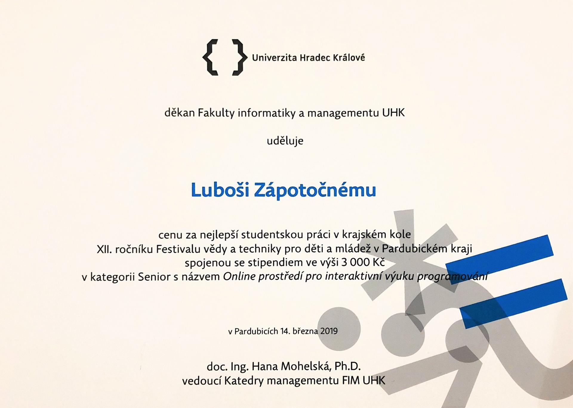 Za svůj hlavní projekt získal Luboš kromě postupu do republikového finále i Zvláštní cenu děkana Fakulty informatiky a managementu Univerzity Hradec Králové pro nejlepší práci v oblasti informatiky.