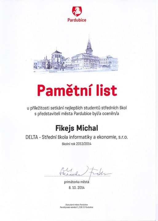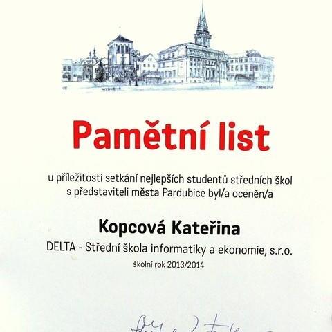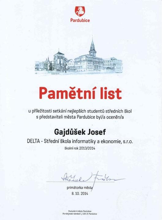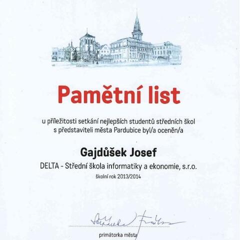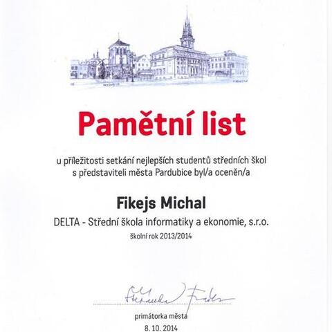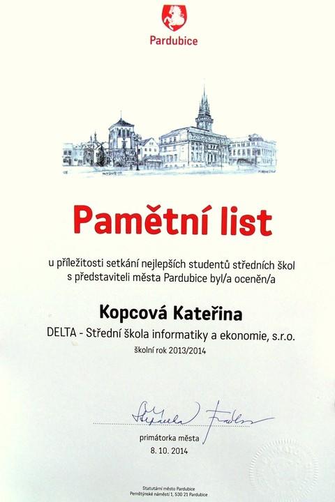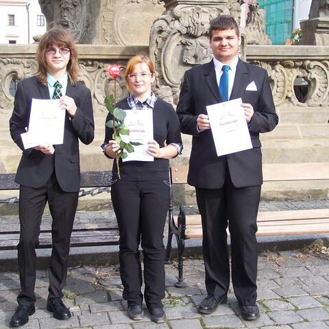 Ve středu odpoledne se trojice studentů z naší školy sešla před pardubickou radnicí. Ačkoliv byli každý z jiného ročníku a Katka Kopcová již letos odmaturovala, měli něco společné. V předchozím školní roce se umístili "na bedně" v krajských kolech soutěží nebo uspěli v kole celostátním. Ve společenském sále radnice se konalo oceňování nejlepších studentů Pardubic. Z naší školy byli oceněni Pepa Gajdůšek, nyní ze třídy 2. B, Michal Fikejs ze 4. B a Katka Kopcová, naše absolventka.