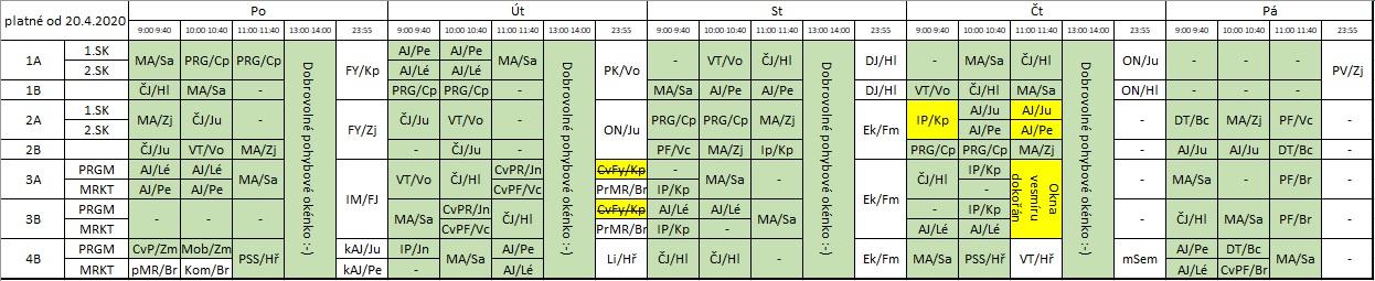 Proto zavádíme pravidelné on-line studium za využití nástroje Microsoft Teams. Výuka bude probíhat podle pravidelného rozvrhu. Hodiny, které jsou podbarvené, budou probíhat on-line s výkladem učitele, případně budou sloužit k on-line konzultacím. V předmětech, které nejsou podbarvené, bude výuka na bázi zadávání zdrojů samostudia a odevzdávání domácí práce. Čas 23:55 znamená, do kdy má být práce z předchozího týdne odevzdána, pokud vyučující nestanoví jinak. Výuka začíná již 17.3. v 9:00. U zelených hodin zapisujeme standardně docházku.