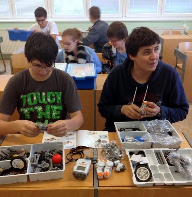 Snažil jsem se prváky co nejvíc namotivovat a samozřejmě jsem se taky na první lekci přišel podívat. Pan doktor Doležel byl naprosto úžasný! Přinesl 8 stavebnic Lego MindStorm a během patnácti minut nás "měl". Rozdělili jsme se do týmů po dvou a už jsme cvakali jednu součástku za druhou. Já jsem se spokojil s rolí třídiče kostiček, protože v některých stavebnicích byl tak trošku kreativní chaos :-). Pan doktor se zjevně vrátil v čase o pár let zpět a s radostí dítěte nám pomáhal hledat ty správné kostičky. Přeci jenom má to v oku. Po hodině práce se objevili první funkční roboti a začalo programování. A ono se to najednou začalo všechno hýbat!!! Tak a teď už tomu dát jenom svoji vůli, aby se to chovalo, jak chceme my! Nechci se rouhat, ale začínáme si hrát na bohy. Postavíme si robota - uplácáme si vlastní stvoření, naprogramujeme jeho chování - vdechneme mu život. A sedmý den bůh odpočíval...