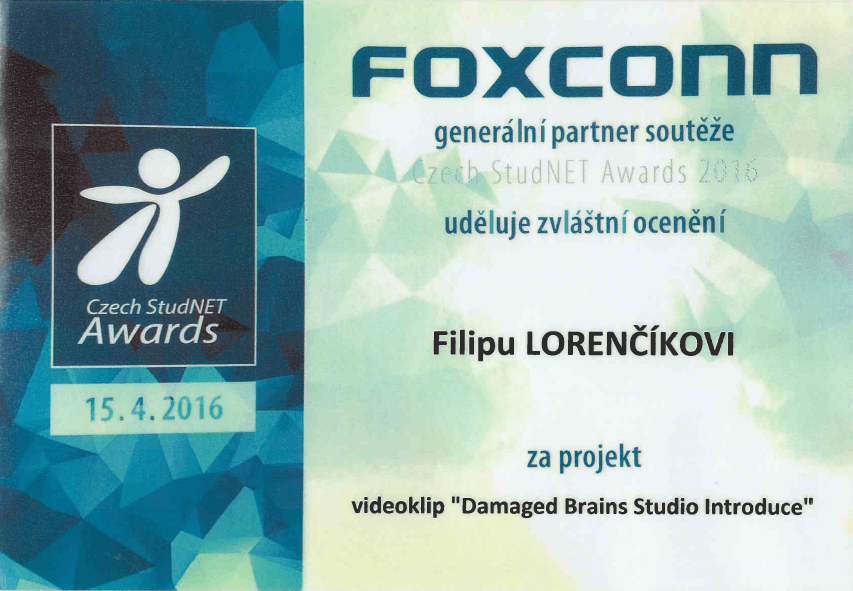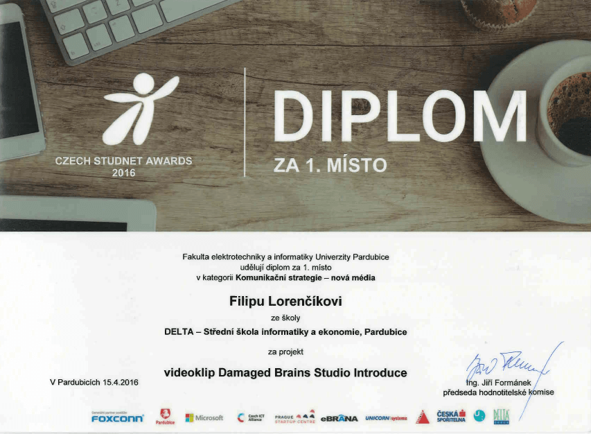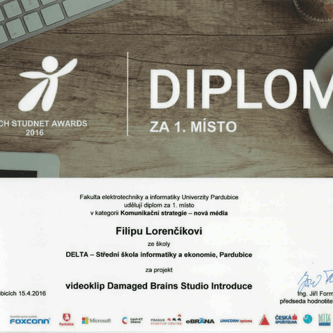 V pátek zabodovali naši studenti i na finále pardubického StudNETu. Maturant Filip Lorenčík se stal celkovým vítězem a obdržel speciální cenu od generálního partnera společnosti Foxconn 10.000 Kč. Zvítězil také v kategorii Komunikační strategie - nová média se svým videoklipem "Damaged Brains Studio Introduce". V těsném závěsu na druhém místě skončil Tomáš Mlejnek se svým maturitním projektem "vstupní analýza Kamenictví Mlejnek", což byla analýza možností internetového marketingu rodinného kamenictví.