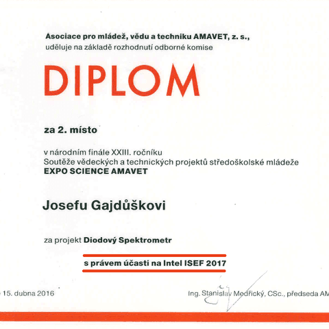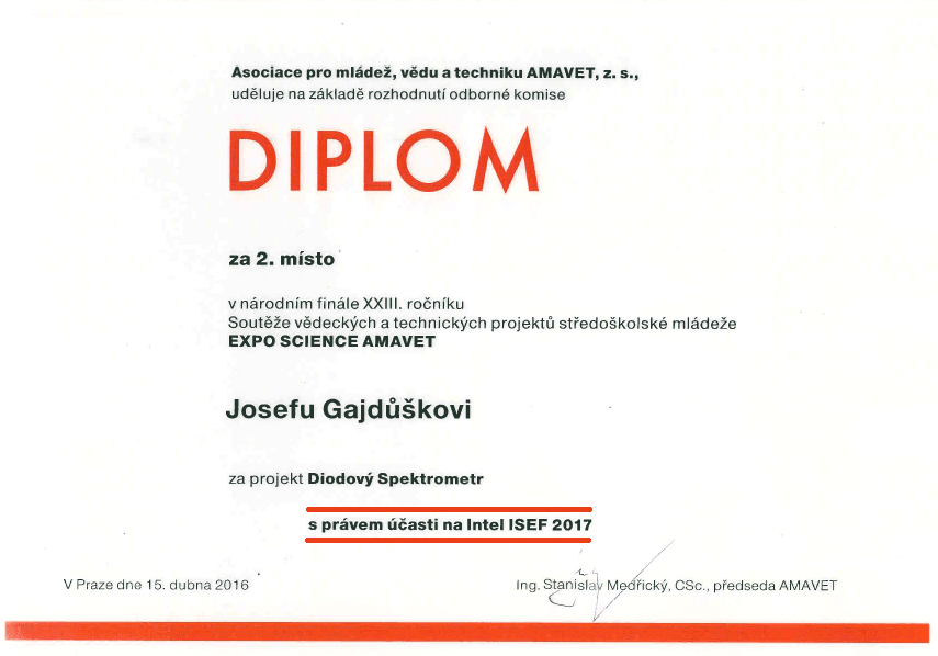 O největší úspěch se postaral opět Josef Gajdůšek, který po získání ceny rektora Univerzity Hradec Králové a postupu do ústředního kola EXPO SCIENCE AMAVET, zabodoval i tam. A to nijak bezvýznamně. Celkově skončíl druhý a vybojoval si tak postup na příští ročník největšího veletrhu studentský projektů na světě Intel ISEF a příští rok poletí opět do Ameriky. Do ústředního kola Expo Science Amavet jej letos doprovázeli nadějní prváci s dalšími dvěma projekty, jmenovitě: Filip Botai, a Michal Havelka s projektem "Volá makléř" a Luboš Zápotočný, Tomáš Faltejsek a Tomáš Čulík s počítačovou hrou "The Tainted". Přijměte blahopřání a Pepovi držíme pěsti na příští rok.