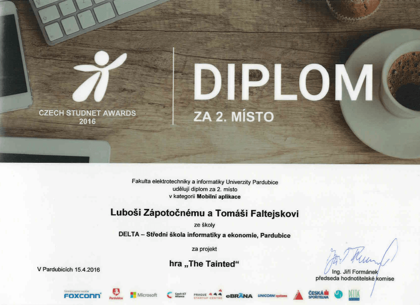 Druhé místo obsadili také nadějní prváci Luboš Zápotočný a Tomáš Faltejsek v kategorii Mobilní aplikace s mobilní verzí jejich hry "The Tainted".