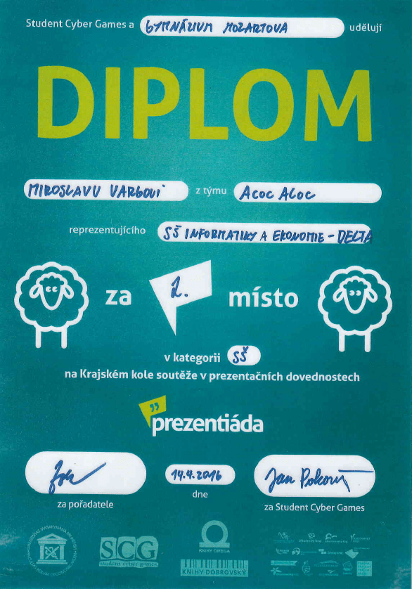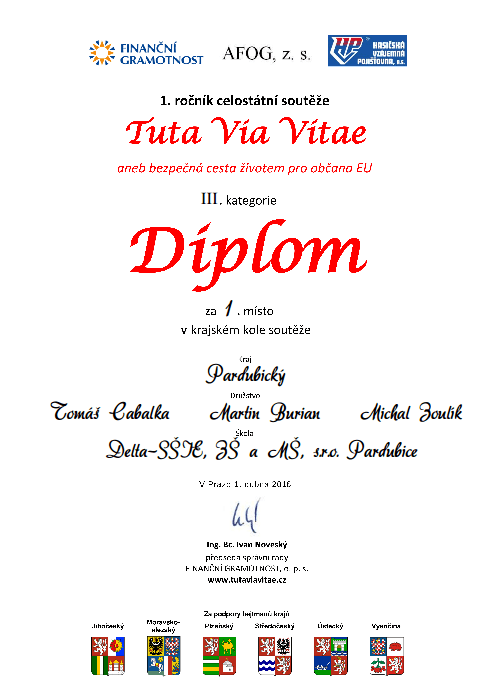 Tým studentů ze 3.B ve složení Martin Burian, Tomáš Cabalka a Michal Zoulík zvítězili v krajském kole soutěže pořádané Ministerstvem školství a postoupili čtvrtým nejlepším výsledkem v rámci celé České republiky do finále. Nejlepší družstva z celé republiky se sjedou 28. dubna v historickém areálu EMAUZY v Praze, kde si to rozdají o konečné vítězství. Našim studentům budeme držet palce.