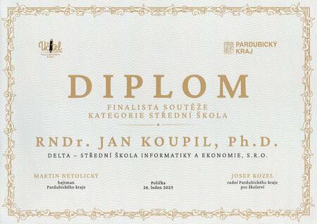 Polička, 26.1.2023: Jan Koupil, učitel programování, internetových prezentací, fyziky a vedoucí maturitních projektů získal ocenění jako jeden ze tří učitelů v kateogirii Střední školy v soutěži Učitel Pardubického kraje. Diplom mu předal vedoucí odboru školství Pardubického kraje Mgr. Martin Kiss před zcela zaplněným sálem Tylova domu v Poličce.