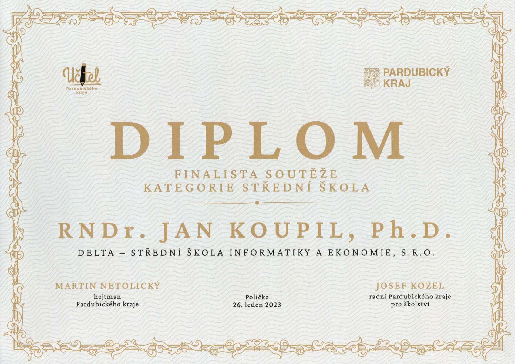 Jan Koupil byl oceněn jako jeden ze 3 nejlepších učitelů Pardubického kraje za rok 2023.