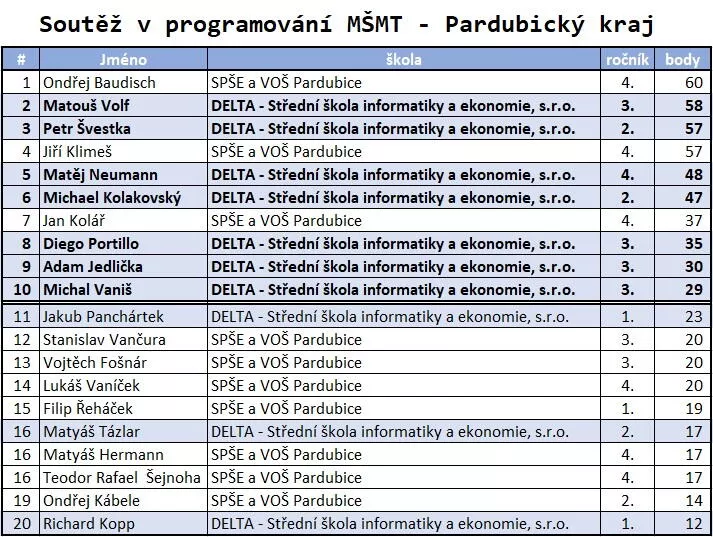 V krajském kole 38. ročníku Soutěže v programování MŠMT se studenti pardubické soukromé střední školy DELTA opět ukázali v plné síle.