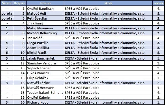 Jelikož se na této soutěži nehraje zrovna o málo (úspěšní řešitelé krajského kola si zajistí přijetí na většinu IT vysokých škol bez přijímaček), byl o ní na Deltě již tradičně zájem. Desítka nejlepších vzešla ze školního kola, kterého se účastnilo 25 soutěžících, a které pomáhali organizovat aktuálně nejlepší programátoři školy Matouš Volf a Petr Švestka (za což jim patří velké díky a také automaticky jedno z postupových míst na krajské kolo). A o tom, že se výběr ze školního kola asi docela povedl, svědčí obdobné pořadí i v kole krajském. Jenom prváci se trošku propadli pořadím, ale aspoň posbírali první zkušenosti z této soutěže.