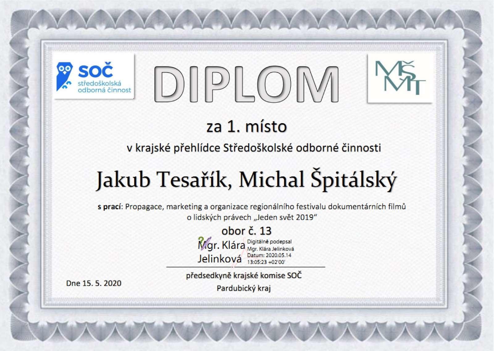 Letos se objevila i extrémně kvalitní práce z oblasti internetového marketingu pánů Jakub Tesařík a Michal Špitálský, tak jsme se rozhodli zkusit SOČ i v pro nás ne zcela klasickém oboru Ekonomika a řízení. Pánové připravili kompletní propagaci regionálního filmového festivalu o lidských právech Jeden svět v Ústí nad Orlicí. Připravili veškeré grafické podklady, vytvořili samostatné webové stránky, omezili klasické vylepování plakátů a začali festival propagovat na internetu a sociálních sítích. I přes snížený rozpočet na propagaci o proti minulým letům se jim podařilo celkovou návštěvnost festivalu zvýšit. Jejich výsledek vyniká o to víc, že letošní ročník festivalu patřil v jiných městech naopak k těm slabším. Jakub Tesařík a Michal Špitálský v krajském kole zvítězili a postoupili do celostátního finále. I jim budeme držet pěsti.