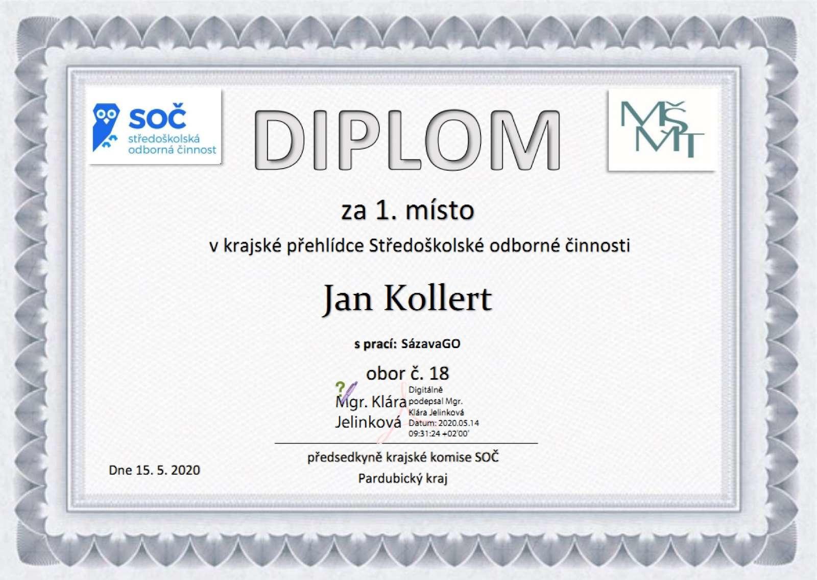 Honza se svým projektem postoupil do celostátního kola soutěže, která se letos měla konat v Mostě, ale vzhledem k situaci s Coronavirem proběhne pravděpodobně také pouze on-line.
