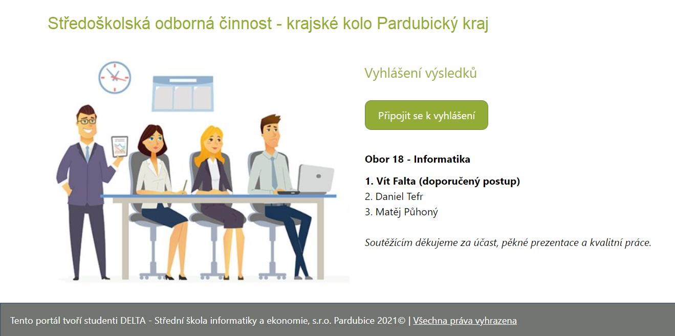 Vítek postupuje do celostátního kola, které se bude konat 11.-13. června. Za poslední 4 roky (kdy se DELTA SOČky účastní), nepoznalo krajské kolo v oboru Informatika jiného vítěze než studenta DELTY.