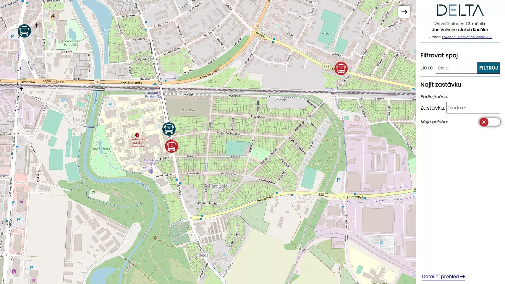 Projekt zobrazuje na mobilním telefonu aktuální polohu všech vozů MHD. Autoři zvítězili v krajském kole Středoškolské odborné činnosti a v celostátním kole v Plzni skončili na 2. místě (2022/2023). Dopravní podnik města Pardubice zakomponoval systém do svého webu.