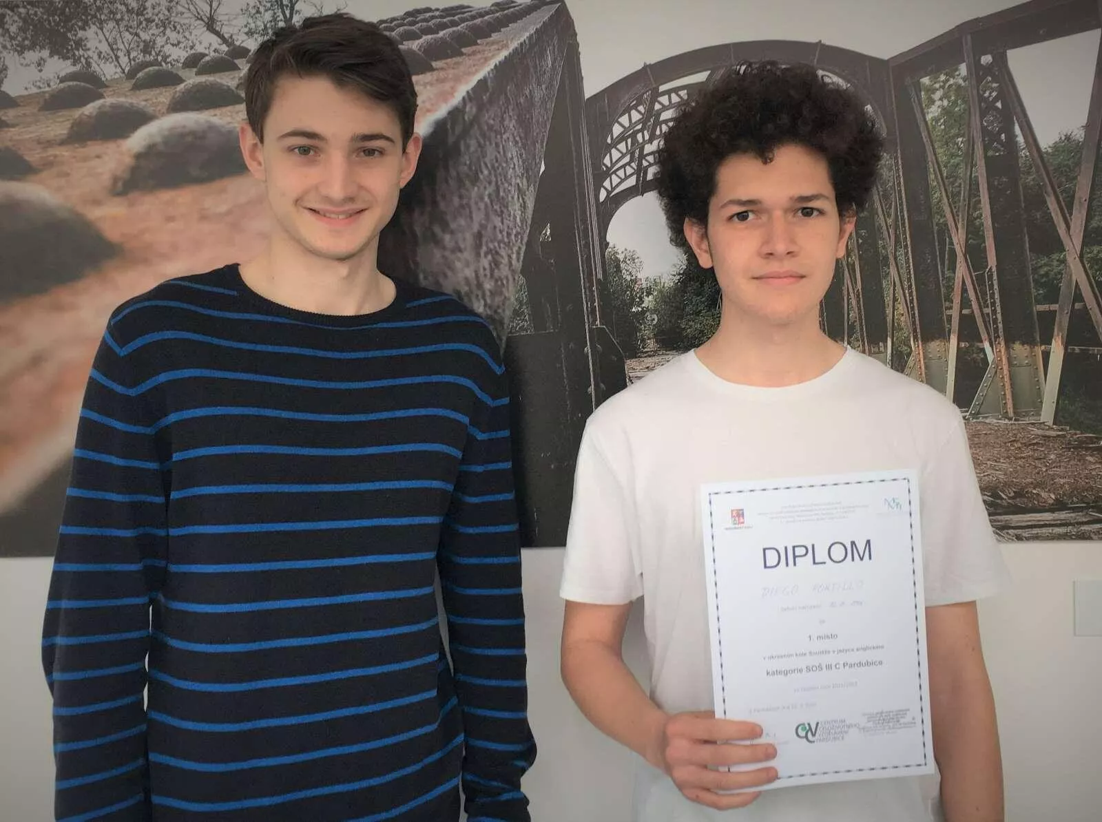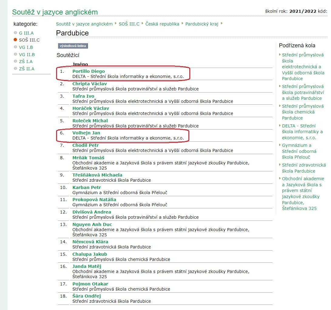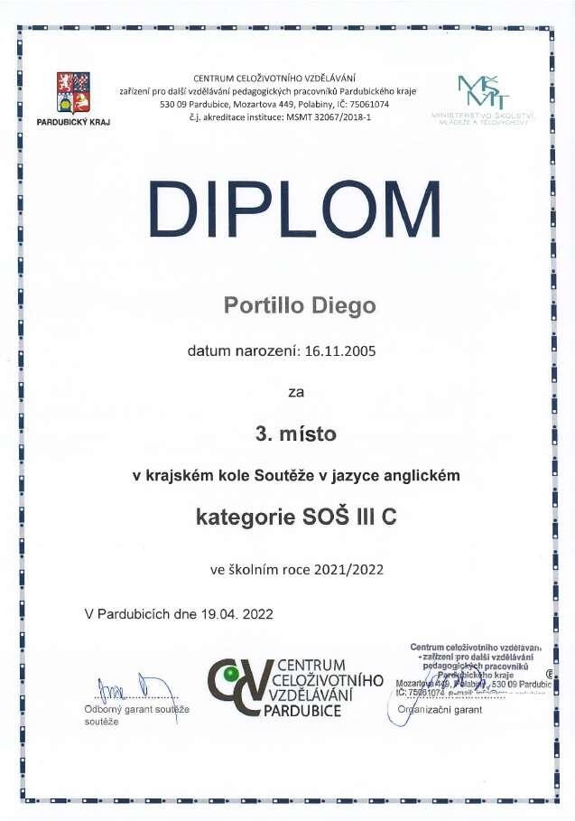 Ve středu 16.3.2022 se uskutečnilo okresní kolo olympiády v anglickém jazyce. V kategorii středních odborných škol zvítězil náš student 1.B Diego Portillo (119 bodů), který postupuje do krajského kola. Na výborném 6. místě skončil druhý z našich studentů Jan Volhejn (112 bodů) ze 3.B. Oběma studentům moc blahopřejeme.
