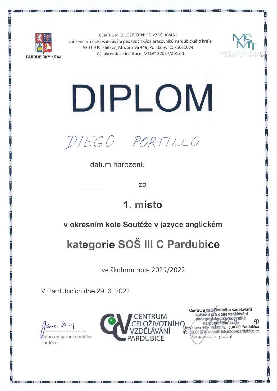 Diego coby vítěz okresu Pardubice postoupil do krajského kola, které se konalo o měsíc později 19.4.2022. Zde se umístil opět "na bedně" a získal 3. místo.