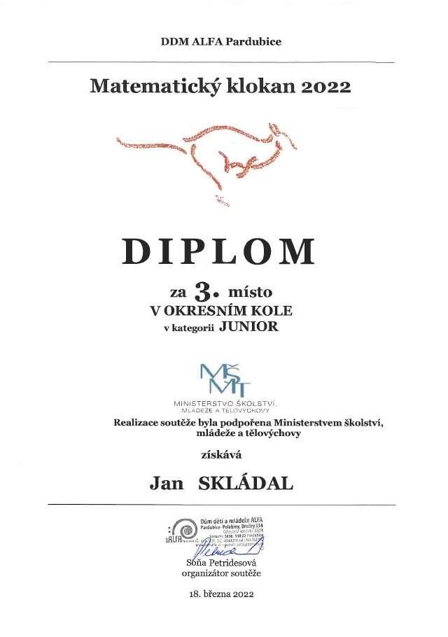 A aby těch úspěchů v tomto týdnu nebylo málo, tak blahopřejeme také Honzovi Skládalovi z 2.A, který se umístil na 3. místě v okresním kole v soutěži Matematický klokan.
